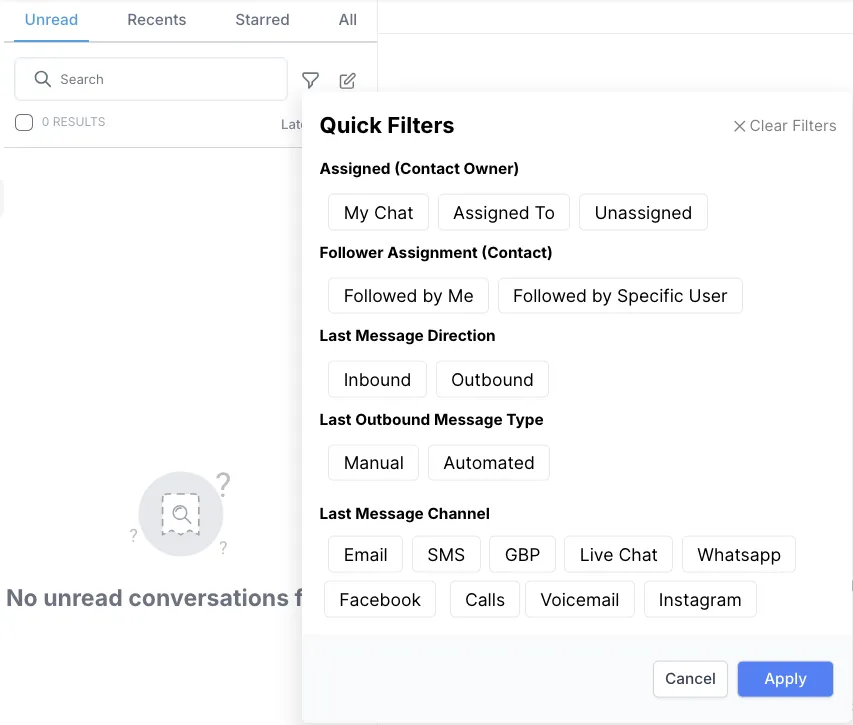 In Kraken CRM, the Conversations tab brings all your communications into one convenient location. You can view and manage email, SMS, Google Business Profile messages, live chat, WhatsApp, Facebook, calls, voicemails, and Instagram messages—all in one place.