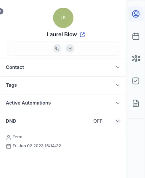 Contact Information: Click the first icon to view and update essential contact details, such as email, phone number, assignee, followers, tags, and DND (Do Not Disturb) status. Any updates are saved automatically.