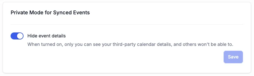If desired, you can enable Private Mode for Synced Events. This ensures that only you can see details of events from third-party calendars, while others won't have access to that information.