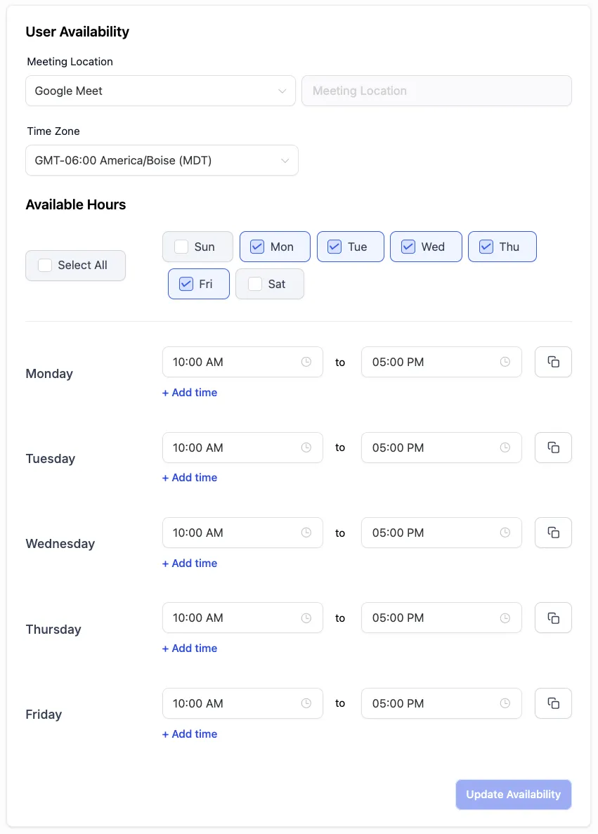 Set your Available Hours for appointments. The system will only book meetings during your available time slots.
